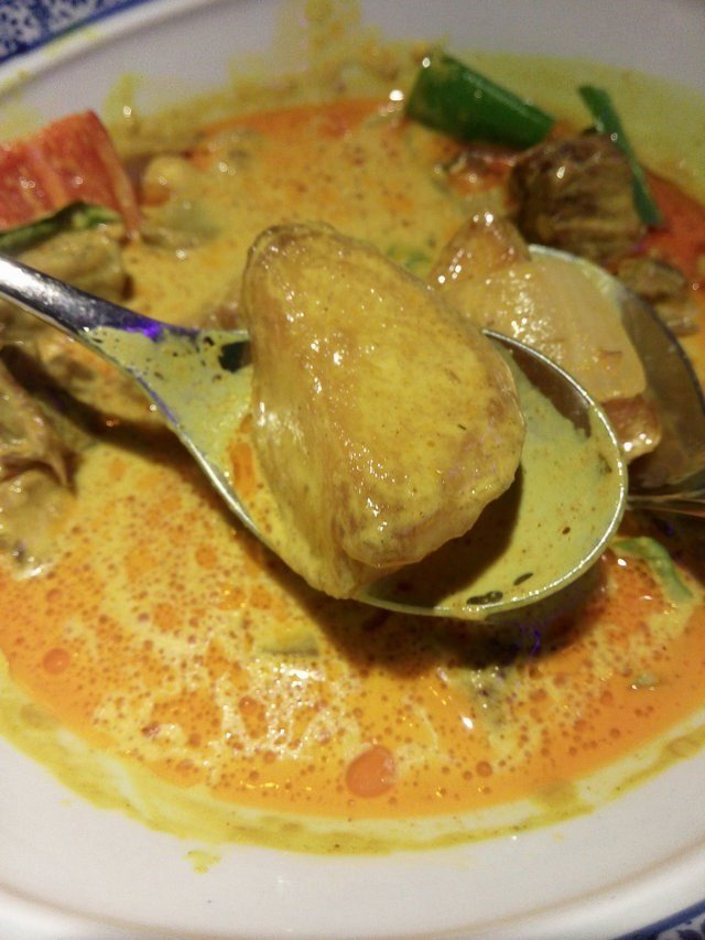 这店做的餐什么都有一点,有点像无国界美食一样啦。不过出品就一般一般,没有想象中的那么好,要了这个椰子鸡,是用老椰肉加青椰的汁来煲的,有一点点的香味,味道偏淡。还要了个咖喱牛腩,卖相还是可以的,就是有一点偏咸了,咖喱不够香,牛腩很少,只有几块,土豆比较多。…查看更多