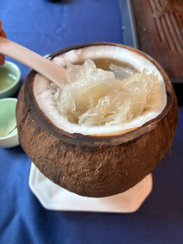這回和朋友踩點「素囍」,還沒進門就被門口的畫面戳中——藤蔓拱門下的貓窩裡,一隻橘白貓懶懶睜眼,旁邊三花貓蜷成毛球睡覺,充滿貓咪的懶散氣息🌿🐱暖黃燈光配深藍花地毯,墨綠沙發與金色小推車把質感拉滿,坐進去就忍不住放鬆下來。當天點的菜每道都踩在喜好上:• 原只椰子炖雪燕湯(72.6元):整顆椰子當容器太有儀式感!雪燕滑嫩掛著清甜椰香,喝一口連喉嚨都潤了,是會想打包的程度~• 素喜冬陰功(68元):酸辣夠味又帶濃郁椰奶香,裡頭蔬菜脆嫩,連平時怕冬蔭功的朋友都扒了兩碗!• 黑椒素扒(58元):口感紮實彈牙,黑椒醬香氣裹滿每一口,完全吃不出是素食,偽肉控必點!• 牛油果卷(半份)(42元):牛油果綿密裹著清爽內餡,淋上酸甜果醬,解膩又開胃~• 芝士薯蓉薄餅(20元):薄餅烤得邊緣微脆,內裡薯蓉混著芝士香,鹹香不膩,當小食剛剛好!連附的大廳餐位小食,擺了新鮮火龍果和花生,細節滿分。兩個人吃這桌(加上服務費總共291.4元),飽足又舒適——門口貓咪療癒,環境像在度假,菜色把素食做得精緻又夠味…查看更多