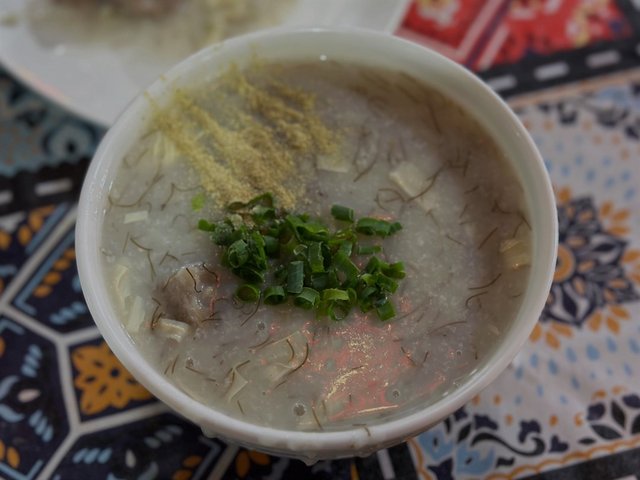 🍖咸骨粥 粥底绵密,满满的料,加了发菜、腐竹和花生。咸骨不咸,骨头肉多,啃着有肉香,我炫了三坨。