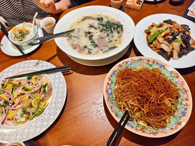 菜單品項豐富,但部分料理如乳鴿已售罄。餐廳提供多款招牌菜,包括冬瓜拆魚羹、芥末檸檬撈雞、燒乳鴿等。我們點選的餐點表現皆出色,特別推薦紫蘇浸沙溪牛肉、蝦子炒麵與百花魚皮。實際上每道菜風味層次分明,且鹹淡調節得宜。