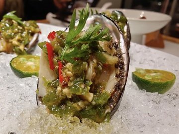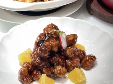 青芥香芒沙律蝦球 / 石烹牛肋條 / 蔥頭油火腿紫菜焗飯 / 香橙黑蒜糖醋排骨 / 關哥稻香封肉 / 泡椒龍躉魚