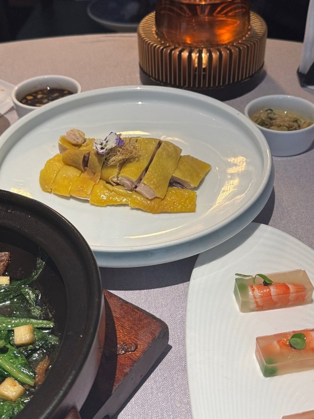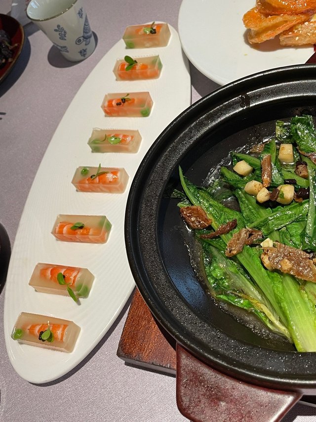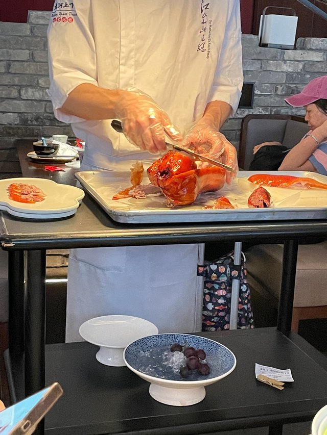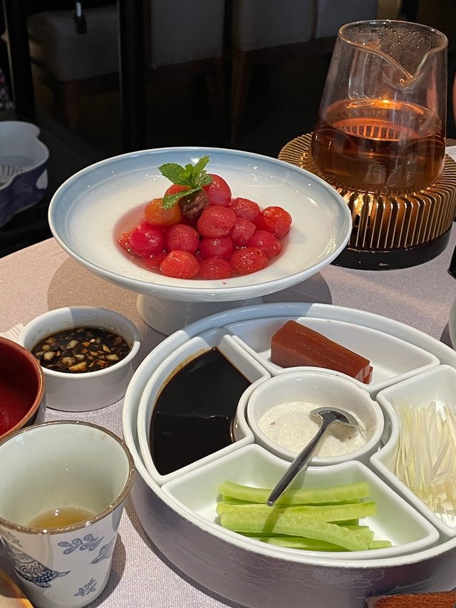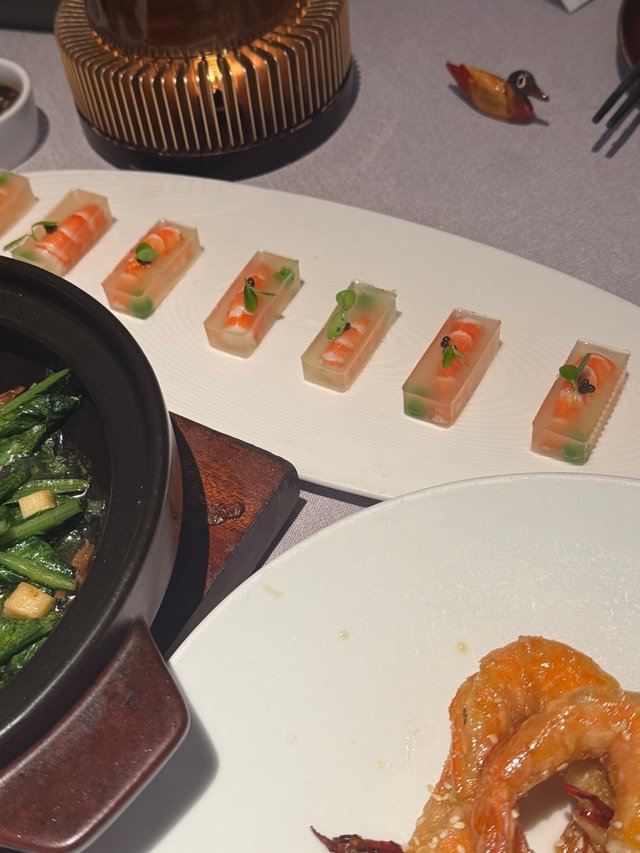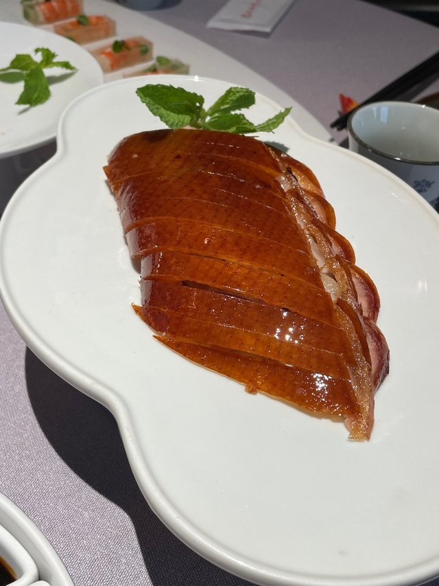 北京烤鸭 鱼子酱虾冻 百香果酥皮大虾 牛肉饺 话梅番茄子 脆皮咸鸡