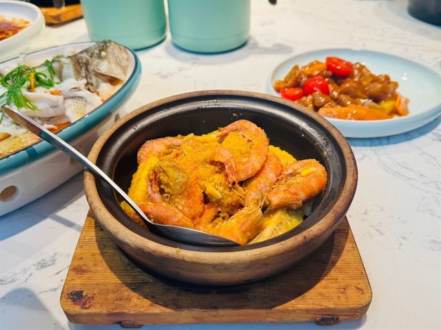 4.咸蛋黄大虾,咸蛋黄和虾结合的特别好,蛋黄的咸香配上虾肉的鲜美,非常完美的一道菜!玉米裹着沙沙的蛋黄也特别美味!