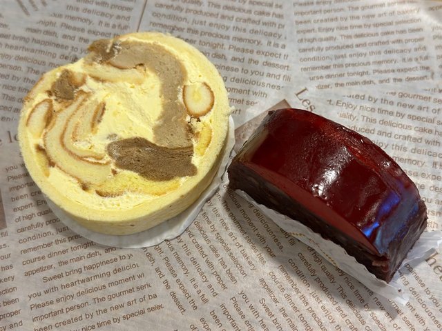 🫘红豆糕:店里的特色糕点,上方的果冻是红色透明啫喱质地,下部分的红豆用料很扎实,绵密软糯。我很少吃红豆类食物,甜度适宜,挺好吃。花卷,更像是蛋糕胚的边角料混着奶油压制在一起,咸甜口,很好吃。瑞士柠檬卷,味道还可以,但口感偏硬,不松软。忌廉筒,外皮蘸有白糖,里面是奶油。吃完感觉口干,出品一般。尝了4款产品,好坏参半。几块钱的小糕点,价格实惠,值得感受一下。