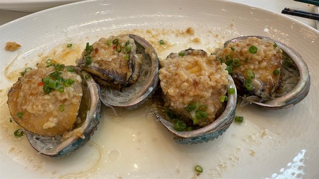 - Abalone with Garlic & Vermicelli (蒜蓉粉絲蒸四頭鮑魚): The star - tender and succulent despite its size.